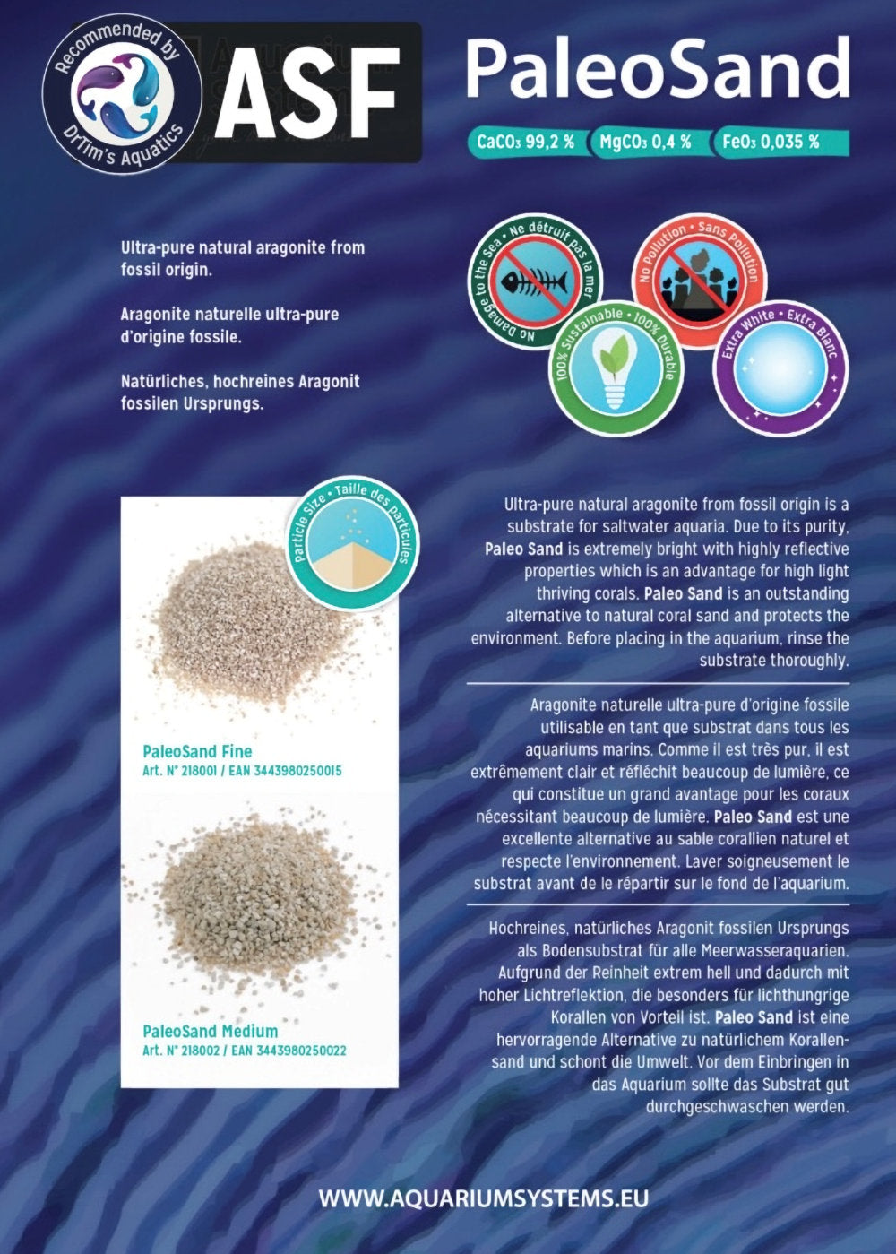 Ultra-pure natural aragonite from fossil origin is a substrate for saltwater or freshwater aquaria. Due to its purity, Paleo Sand is extremely bright with highly reflective properties which is an advantage for high light thriving corals. Paleo Sand is an outstanding alternative to natural coral sand and will also increase the alkalinity of your aquarium water.