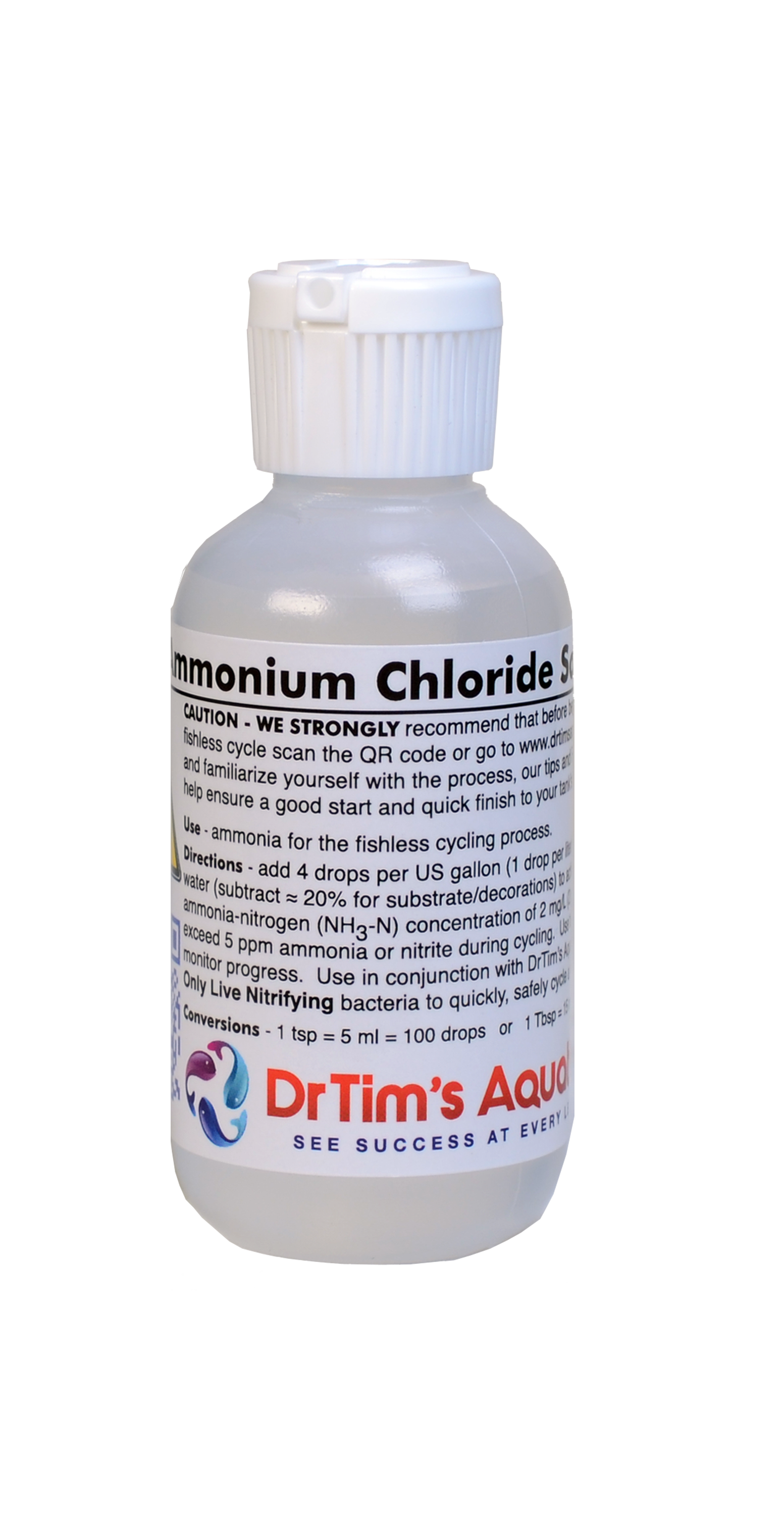 Dr Tim’s Ammonium Chloride Solution is a reagent-grade source of ammonia designed specifically for fishless cycling when used with Dr Tim’s One & Only Nitrifying Bacteria. With a concentration of 40 mg/ml of total ammonia-nitrogen (TAN), it provides a safe and controlled way to feed beneficial bacteria during the cycling process—without exposing fish to harmful ammonia levels.