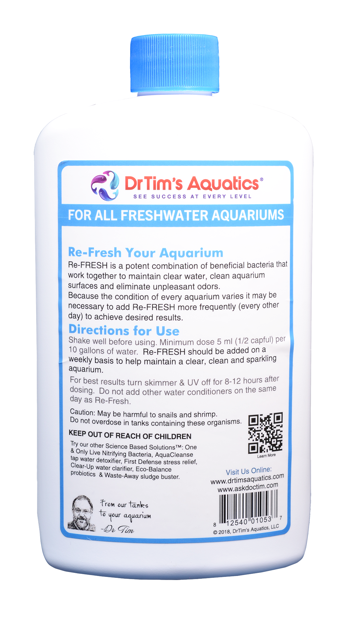 Keep your aquarium water clean, clear, and odor-free with DrTim’s Re-Fresh. This 100% natural formula uses a powerful blend of beneficial bacteria to target and eliminate green and brown grunge both in the water and on aquarium surfaces.