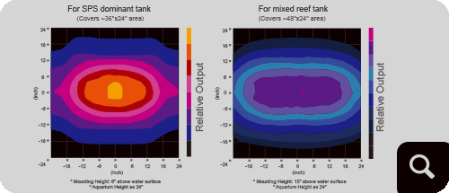 Kessil is known for leading in multichip LED light tech. Excellent spectrum-blending qualities and balanced light spread has been something we and many hobbyists have come to count on from them. Kessil's patented Dense Matrix Array packs 55 LED chips into a space smaller than a quarter. With 110 LED chips between two arrays, the AP9X has the best color mixing in the industry - no diffuser necessary and no disco-ball effect! The latest iteration of Kessil’s Dense Matrix array places the chips closer than ever before. More chips in a tighter space results in better color mixing and a brighter single point source - just like the Sun on a natural coral reef. The redesigned optics provide an even light distribution that blankets your aquarium with up to 48” of coverage and can provide useful PAR levels as deep as 30" below the surface. This uniform coverage minimizes hotspots and creates an effect similar to that of a metal halide / T5 combo.