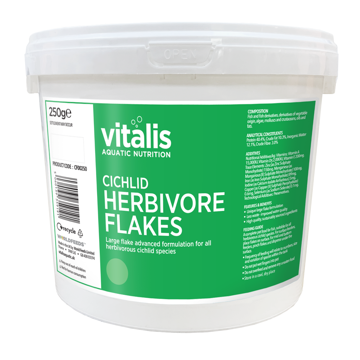Vitalis Cichlid Herbivore Flakes are specially formulated to meet the lower protein requirements of herbivorous cichlid species native to Africa’s Rift Lakes, including Tanganyika and Malawi. Enriched with nutrient-rich algae and spirulina, these flakes support healthy digestion and vibrant colouration thanks to natural pigments in the ingredients.