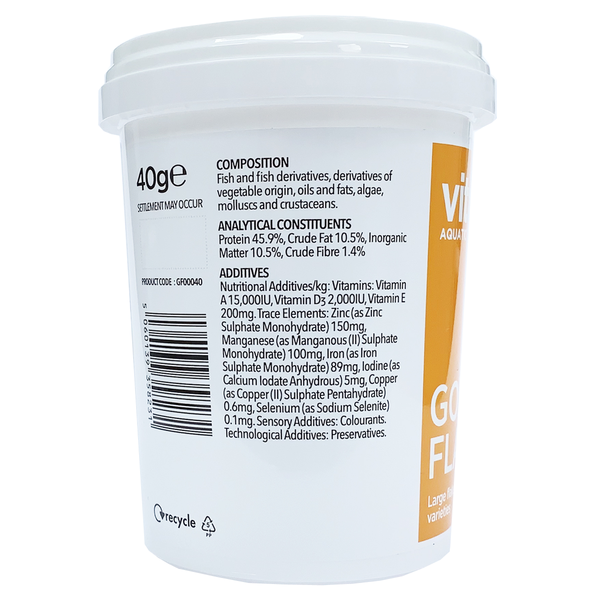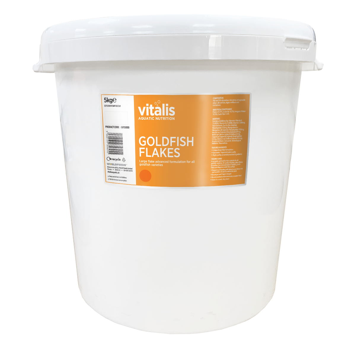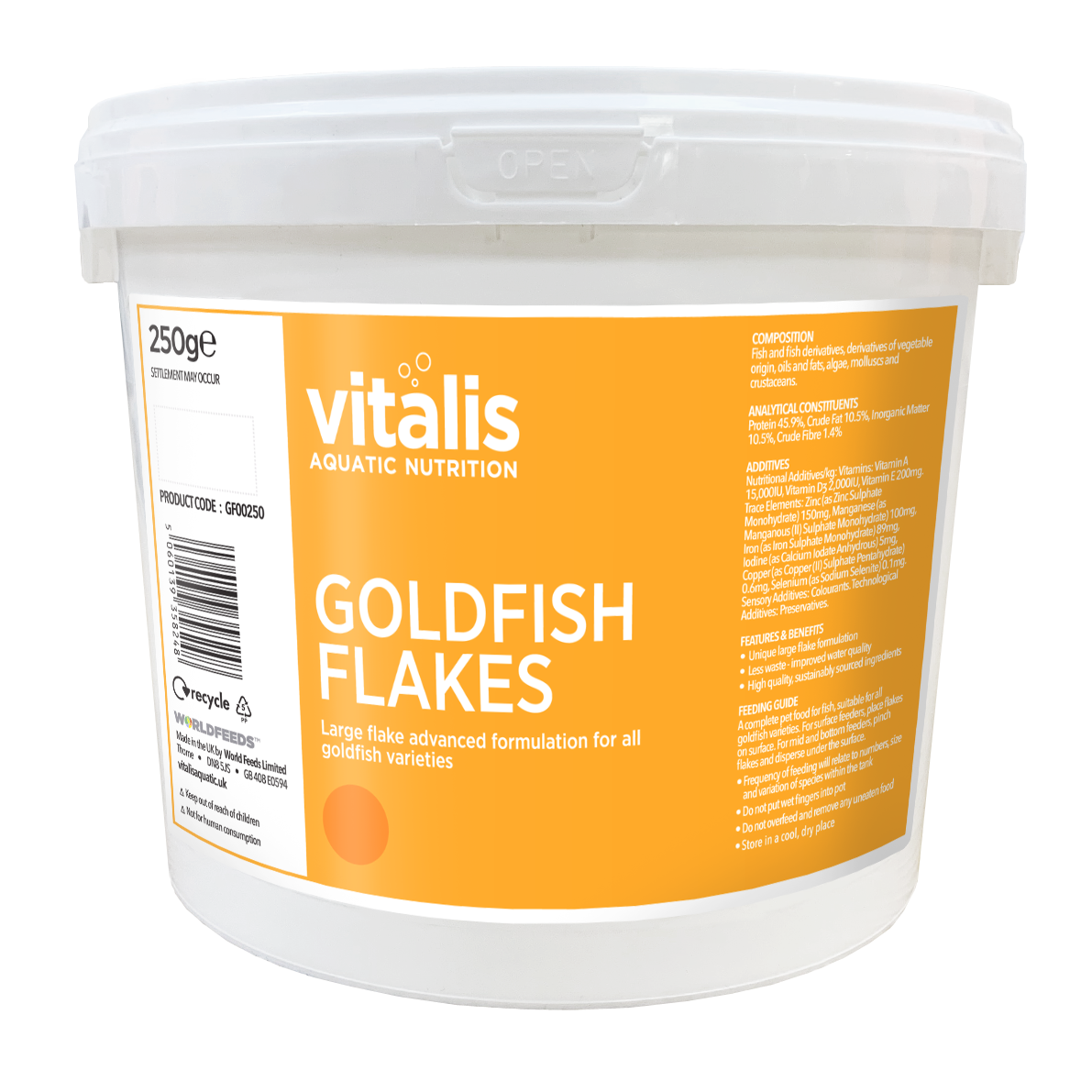 Vitalis Goldfish Flakes are a complete, highly palatable diet designed to support the health, vitality, and natural colouration of all goldfish types. Enriched with natural pigments and a tailored blend of vitamins and minerals, this flake food promotes optimal condition and vibrant appearance.