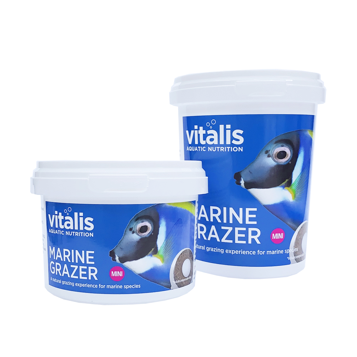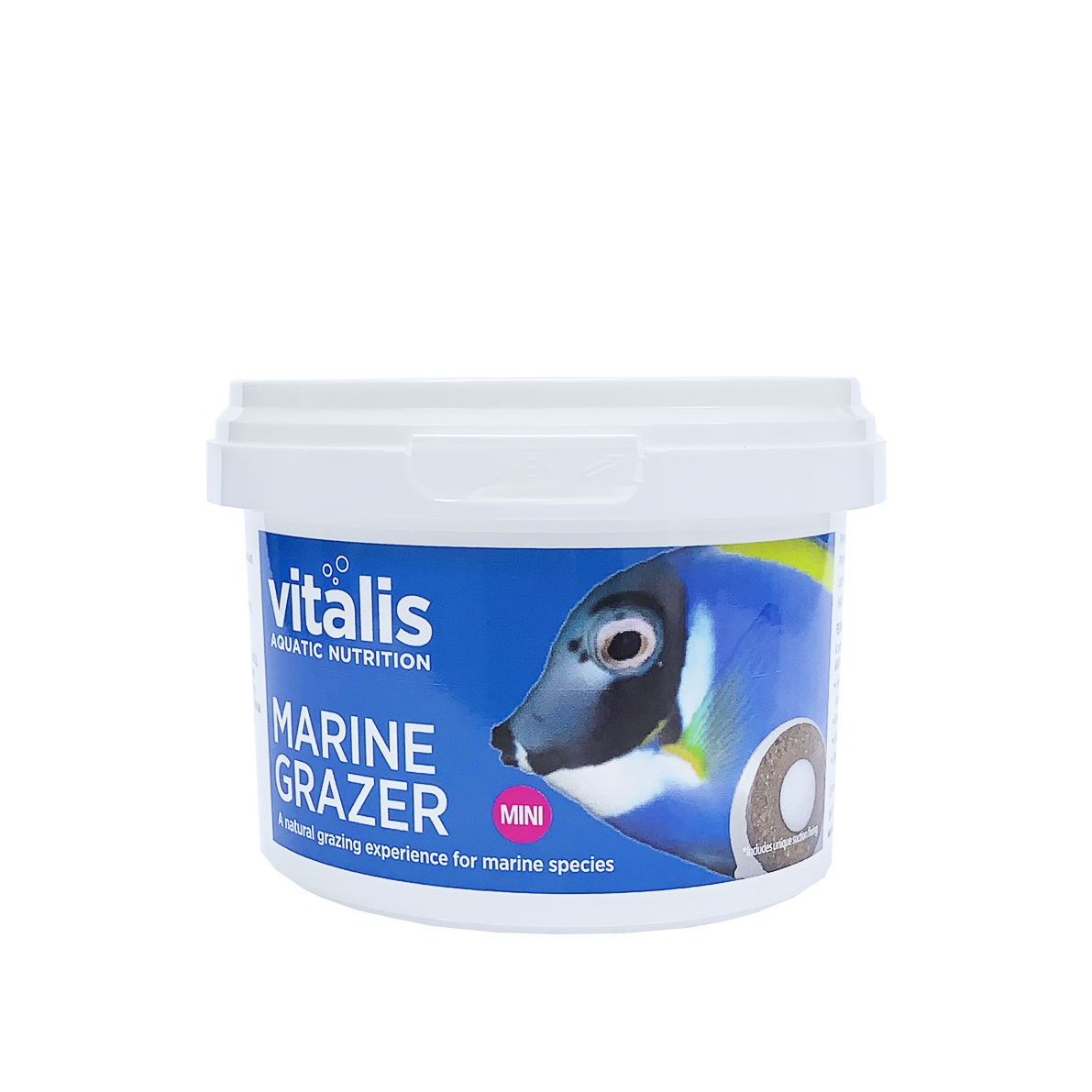 Vitalis Marine Grazers are a complete, highly palatable diet developed to meet the specific nutritional needs of marine grazing species. Presented in unique Mini Grazer rings, these soft, water-stable feeds can be easily attached to the inside of the aquarium using the included suction fixings—encouraging natural foraging behaviour and allowing you to observe your fish feeding just as they would in the wild.